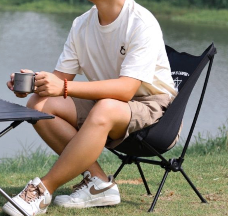 キャンプでくつろぐためのリクライニング機能付きコンパクト折り畳み椅子